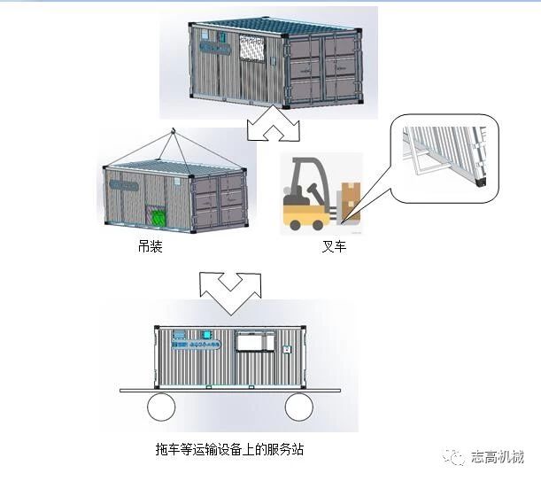The service station is of container type, welded from steel plates and rectangular tubes, and can be moved to transport equipment such as a truck using a crane or forklift.